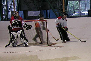 | 第2試合、Jads. vs THURSDAYの1戦は前回の試合結果から予想される展開は明らかにJads.不利であったが開始早々それを裏付けるかのようにTHURSDAY、0番渡部選手がゴール前でパスコースを読み、これをインターセプトすると、素早いシュートで先制点を上げる! 天を仰ぐJads.選手、いきなりマットに沈むJads.ゴーリー。 試合はこのままTHURSDAYペースで進むものと予想された。 しかしJads.は3:24、68番谷口(華)選手がTHURSDAYゴーリー石井選手の壁を破ると、第3クオーターにも4番谷口(泰)→69番西本選手の連携で貴重な追加点をあげ、2−1と逆転! THURSDAYはシュート本数36本と20本のJads.を圧倒する攻撃を仕掛けながら、Jads.ゴーリー谷口のスーパーファインマグレセーブまで飛び出しペースを乱され、その実力を発揮できないままゲームセット!何と大番狂わせでJads.が首位THURSDAYを破ることとなった! |