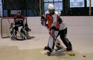 | 初戦の固さからか得点が前回得点につなげることの出来なかったバクテリア。熱戦のシュートアウト後に惜しい試合を引き分けとしてしまったDRAGS。 両チームの意気込みとは裏腹になんとリンクコンディションが悪く、湿度のせいか、時間がずれこんでしまった第1試合。 両チームの集中力にこの1時間遅れがどれほど影響するだろうか・・ いくらかの改善はみられたものの、まだリンクの状態は決して良くないまま両チームの合意で開始された第1試合は、前回から得点を欲していたバクテリアの猛攻から始まった! 試合開始0:53、バクテリア77番金田選手のゴールでベンチが歓声に包まれる!さらに応援に応えるかのように3:11、11番内田選手のゴールで喜びに沸くベンチ! しかし6:00、DRAGSは2番鶴谷選手→8番日高選手のゴールで落ち着きを取り戻すと第2クオーターには8番日高選手→88番武藤選手の連携で連続ゴールを上げ逆転!第2クオーターを終了して3−2とDRAGSが試合自チームのペースに持ち込む。 しかし流れが変わったのは第3クオーター。 バクテリアがパワープレーで得点すると9:56、51番原選手→77番金田選手のゴールでついに同点に追いつき両者は一歩も譲らない戦いとなった! 第4クオーターも両チーム2得点をあげ同点で迎えたシュートアウト。 バクテリアはこの日4ゴールをあげた77番金田選手を先頭にゴールをあげ、11番内田選手もゴールを上げると、DRAGSはこの日2ゴール2アシストの8番日高選手が止められ5人目に4得点を上げていた武藤選手に順番が回ることなくシュートアウト0−2でバクテリアに惜敗することとなった!バクテリアには嬉しい勝ち点がつき、惜しくも敗れたDRAGSであったが自分達のペースで序盤の劣勢を引き戻せる力があるだけに今後の巻き返しに期待したい! |