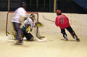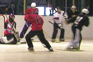 YSHL2の一戦。 試合は序盤から積極的にシュートを試みるTeam YSHL2が68番内藤選手のゴールで先制! しかし再三のチャンスを"W"RED-ZONE88番笹尾(修)ゴーリーに阻まれファインセーブを連発!! あまりの素晴らしいセーブに敵Team YSHL2ベンチからも賞賛の声があがったほど! Team YSHL2エースの77番須永選手も1点に抑えられ第2クオーターを終えて2−0と攻めながらも得点が取れない嫌な展開に持ち込まれる。 後半センターリング型の攻撃へ転換したTeam YSHL2の攻めがついに"W"RED-ZONEの固い門を開け第4クオーターに4得点と安全圏へ逃げ切り、最後に"W"RED-ZONE93番下村選手の完璧なコースのシュートを決められたものの、この試合28本のシュートを1失点で抑えたTeam YSHL278番町田ゴーリーが激しいゴーリー争いを征し見事ベストGKのポジションに着くこととなった! |