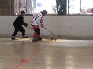前回はGKのいないベーハーに大勝したものの、この試合ではどれだけの実力をもつのか未知数のCRUSHERS。 対戦相手は常に接戦でここまで1勝1敗のTHURSDAY。 この試合もロースコアの接戦かと思われたが意外な出だしとなった! まずはCRUSHERS19番キャプテンの山口選手が先制点をあげると、これに続けとばかりに77番長澤選手、88番山本選手、48番土方選手とゴールラッシュ! なんとTHURSDAY相手に1ピリオドで一挙に6−0と大量得点を叩き出す! この点差はこのクラスでは決定的かと思われた第2ピリオドからTHURSDAYも反撃を開始! 33番佐々選手のゴールを皮切りに14番荒川選手のゴールで連続得点するも要所要所でCRUSHERSも追加得点をあげ追いつかせない点の取り合いとなった! 試合は合計7点をあげたTHURSDAYであったが順調に追加点を加えたCRUSHERSが11−7で快勝! すさまじい攻撃力を見せて1位をキープしている! |