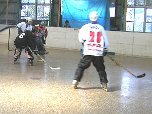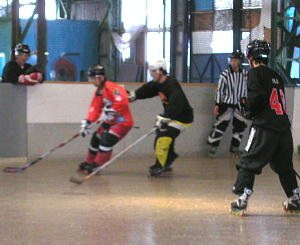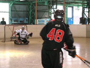 | 準決勝を迎えたリーグ2の第1試合は、2位通過のCRUSHERS対戸塚魂の一戦! 第1ピリオド先制は1:47、戸塚魂96番ウラジミル選手のゴールで幕開け! さらに5:47にも追加点を加えて2−0と快調な出だしを見せる! 何と言ってもリーグ戦で戸塚魂はシーソーゲームでの逆転負けを喫しているだけに序盤から気を許さない構えだ。 しかし直後の7:12、CRUSHERS48番土方選手→3番太田選手の連携で反撃を開始すると9:01にも連続ゴールを決めて第1ピリオドで2−2と同点に追いつく。 泥沼の展開を避けたい戸塚魂は第2ピリオドから決定力を見せ、9番鈴木選手の連続ゴールで4−2! それでも第3ピリオド0:58にCRUSHER19番山口選手→7番湯沢選手のゴールで再び1点差に迫るがその後は両者追加点を加えて5−4と差が縮まらず。 最後まで集中力を欠かなかった戸塚魂は第4ピリオドに追加点を加えて8−5とCRUSHERを振り切って決勝へ駒を進めた! |